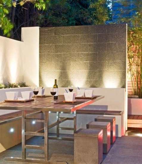 在花园中直接划分一个空间出来,设计成一个餐厅,中规中矩的餐厅设计。而点睛之笔在于坐垫下方的LED灯,让这个空间在夜晚更有情调。