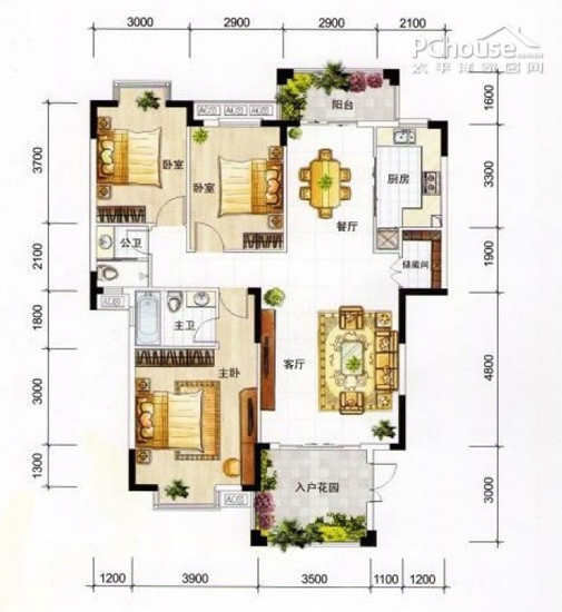 户型优点 | 1、整个空间布局方正实用功能性强。 2、公共区域空气前后对流。 3、有个功能性很强很休闲的入户花园。 | ||