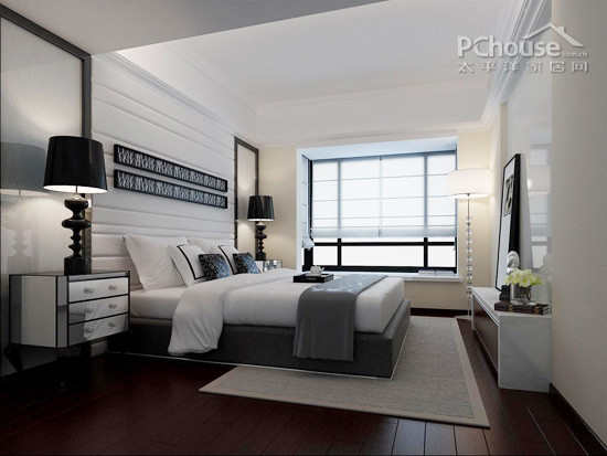 6、 主卧的设计,主卧有个超的储物空间和一个2米的豪华双人床,利用窗下的空间放个精致的休闲沙发,这让整个空间得到了升华。主卫用玻璃隔断来做干湿分区。