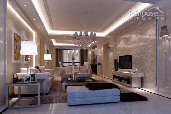 客厅打造低调的奢华感,浅色的家具与花纹的电视背景,都包含了欧式的元素,加上灯光的衬托,简欧风格会比现代风格高档一些。