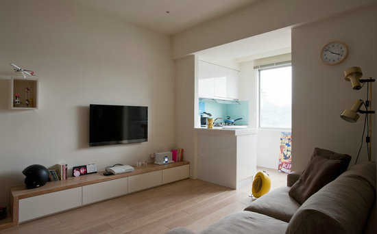 甫入空间,黑板墙上的涂鸦宣告了屋主性格故事,篮球员简报、过年时朋友来访的留言加上拍立得影像纪录,一点一滴勾勒出了生活轮廓;色彩运用上a space.. design将立面处鲜艳的蓝转以浅灰,客厅沙发背墙局部的镂空让客厅与书房采光有了互动,也让一个人的生活多了份自在。同样的阳光轻洒,设计师陈炎腾破除原格局中厨房的封闭性,让光影跨越炉灶有了清新样貌,而旧有厨具尺度过小使用不便问题,在此也有了完美解决方案。