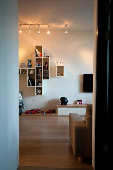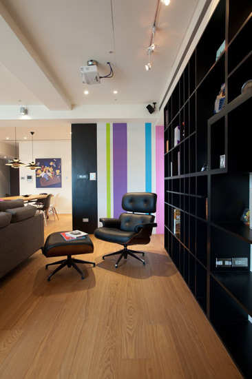 客厅沙发背墙处以黑色沉稳构筑展示架,不仅让公仔有了全面性的舞台,也创造聚焦性的视觉变化。