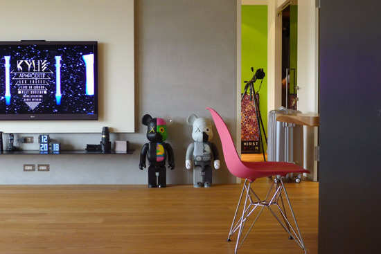 居家空间色度是饱合且充满对比性地,空间中不时可见其对当代涂鸦大师KAWS画作与公仔的狂热喜爱。