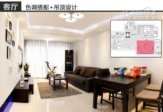 客厅:电视墙两边采用黑色的钢化玻璃装饰,使白色背景墙不至于单调,玻璃的材质也有放大空间的作用,而其中一边还“隐藏”这一扇房门,这种“隐形门”的设计不仅别致,更是避免了客厅有太多门的“风水”问题。