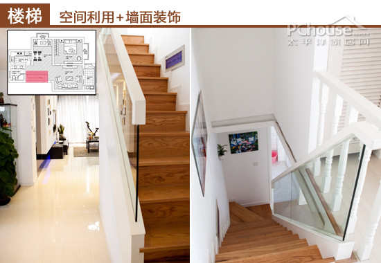楼梯:设计师在楼梯下打造了一个储藏室,能收纳不少生活用品。楼梯的原木色系的台阶少了单调与冷感,多了些温暖的触感。简简单单的扶手是设计师的小创意,透明玻璃增添使楼梯看起来不呆板。