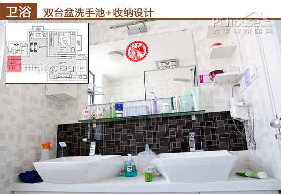 3、卫浴:小卫浴间竟然规划出了双台盆洗手池,这个设计非常实用,洗手间依然是白色调为主,有放大空间的作用,配上黑色的马赛克装饰,使白色不至于刺眼。