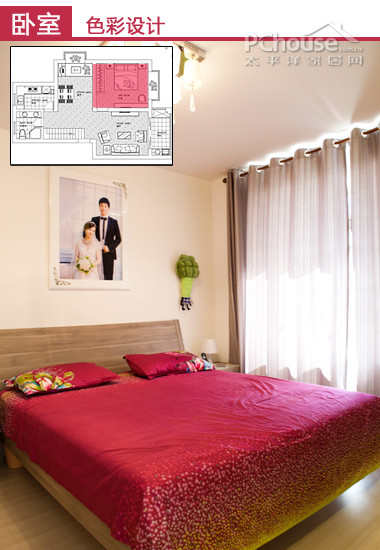 卧室:卧室以纯白和原木两色为主,突出婚房卧室的温馨柔和感。红色的床单、双人枕套、墙上挂的婚纱照都营造了婚房温馨喜庆的气息。墙上挂的绿色小饰品又给卧室增添了生机和活力。
