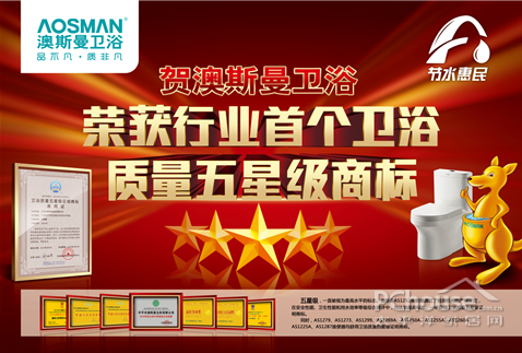 澳斯曼卫浴系列产品,于2013年4月荣获卫浴质量五星级证明商标准用证,成为首家获此评定的民族卫浴品牌。五星级的质量典范,见证了澳斯曼卫浴一直以来对品质的不懈追求。