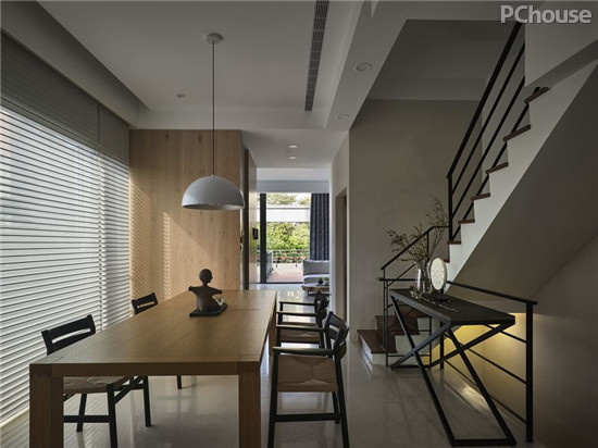 拾阶而上,明净的用餐区域跃然面前,狭长型的公领域在眼前舒展,开启生活场所的宁静主题,并透过黑色金属及木质物件构成安稳意绪,形塑紧密而不凌乱的流畅视感;只待风光洒入,自在晕染左右场域,成为涂刷家居的温暖淡彩。每晚当吊灯开启,点亮一桌细心佈置的餐饭,引领家人细细品嚐那幸福滋味,将歷经一日的五味杂陈在暖心谈笑中咀嚼消化。