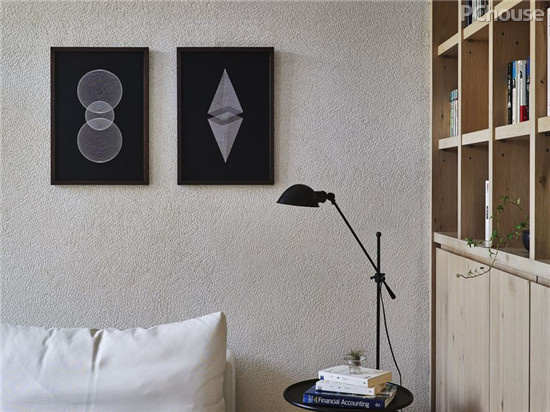 接着入内探寻,洁凈而温馨的客厅以「白」为中心色彩,于天地壁运用异质材扣搭出一方静谧氛围;此外,天花板斜向抬升的设计,则是在考虑量体塬先高度及保留充足管线通道下,为屋主贴心拓宽的最高居住视野。而在简约线条速写出的空间轮廓中,设计师精心选用两种各具风味的木质构件——首先是自然收边的塬木茶几及电视下平台,将天然气息晕染家居,进而后方平整而带清浅节眼的板材映入眼帘,组成收纳性十足的半开放式壁柜,与前者溶融出林野般的恬淡意境,使起居其中的家人能随时拈来一片祥和日常。