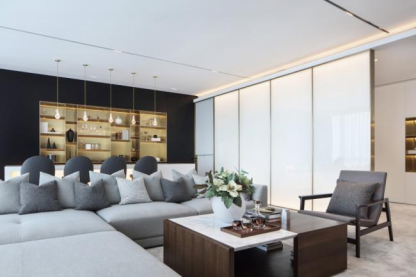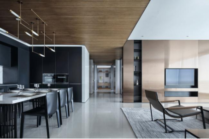 一条东西轴线将所有的功能区串联,南北设置多个入口且对应联通。两侧通透的落地玻璃,引庭院、回廊美景入室,敞开联动式分区极大拉伸空间格局,彼此对话又互不干扰。