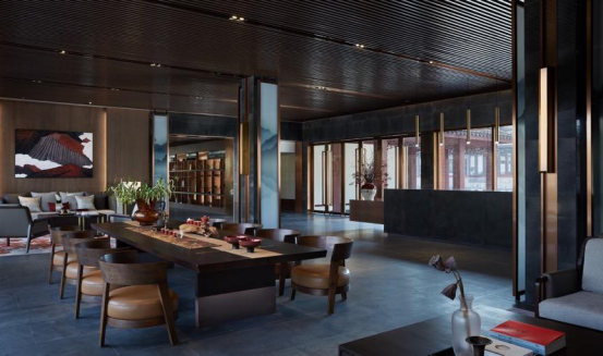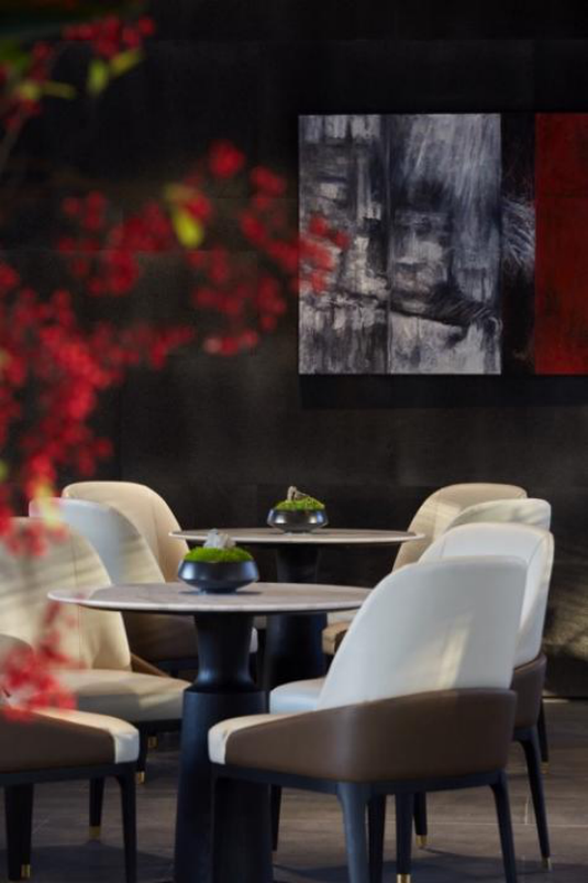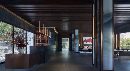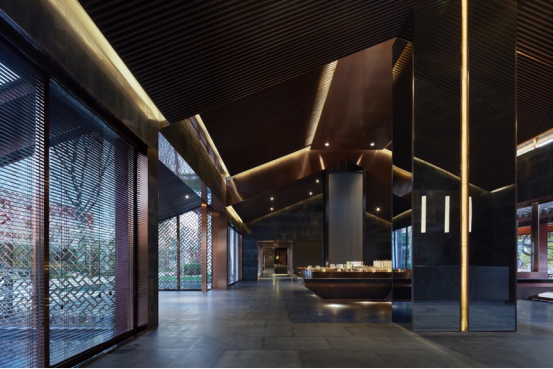 大堂内注重材质的克制与平衡,大面的黑色基底将仪式感与雄浑气势渲染而出。金属镂空格栅显江南韵律,斜屋顶及顶端挑空区窗口,则是对传统物态的解构与再造。剥开视觉表象,映射出来的是现代、东方、艺术、自然等内核元素,给宾客无与伦比的感官体验。