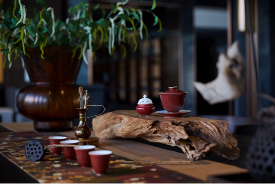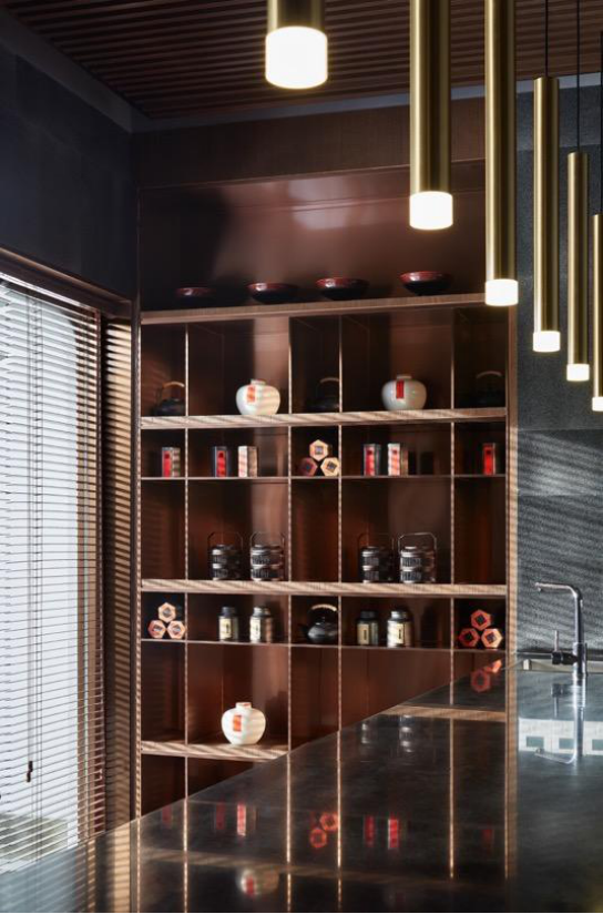 传统古朴的根雕茶台、日式丝织茶席,结合多样材质混搭,铺展开一室古雅清惬。于此饮茶一瓯,以袅袅升腾的水雾构就品茗论道的精神栖居。水吧台与茶室相对,茶文化展示架使用木格与金属层板相交设置,以其跳跃性突破常规。