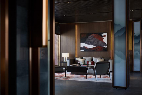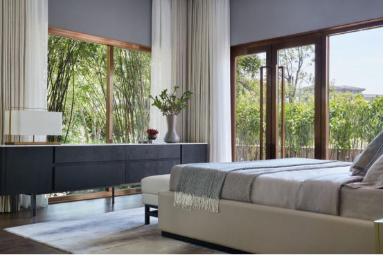 客房套间以现代简约风范融入自然,呈现安宁惬意之境。设计师赋予其三面环景的奢享体验,实现室内与自然的对话,物器与光影的互动。