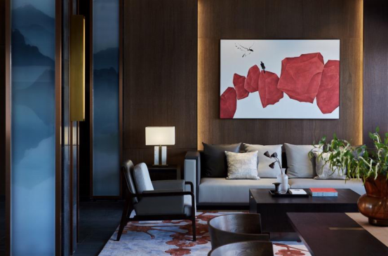 挂画则撷取山、石、云、鸟等自然意象,既呼应周边极佳的景点特色,同时也是对诗意与艺术格调的升华。