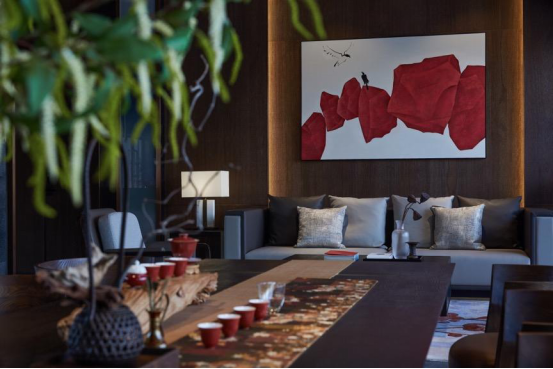桌面借由点点红绿添色,打破单调,越发渲染生机与活力。两端放置着极富水墨晕染状的抽象画作,以厚重的文化底蕴来响应当下的时空与场域。