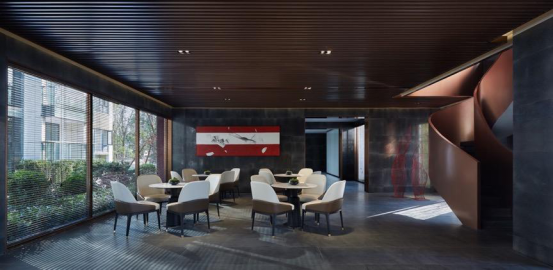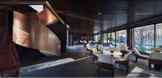 大堂西侧,全景落地玻璃及百叶搭配,加以园林框景手法,呈现意境之美、隐隐约约之效。穿回廊而过,便见洽谈区,顿时豁然开朗。