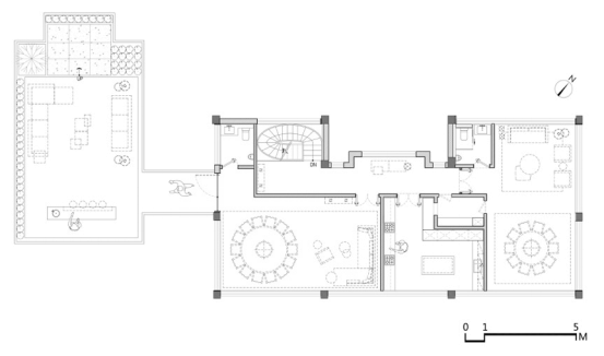 二楼设有两间独立包厢,供宾客携友享用。保留古建筑原有倾斜屋顶,尊重格局而做设计,大道至简,方圆之间,各得其妙。借由通透的落地窗引入美好景致,让视线变得有趣,用餐更为舒适、自然。