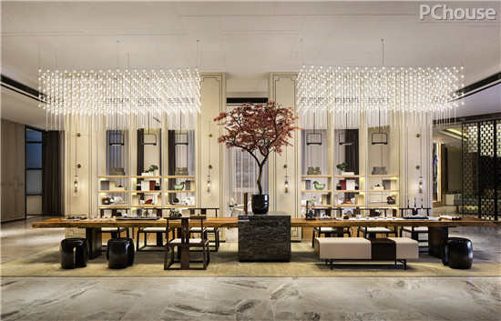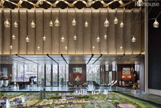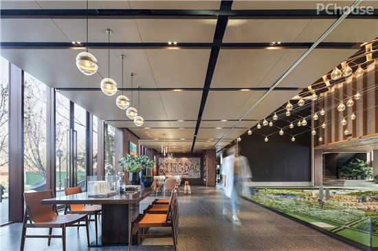 沙盘区空间朗阔亮敞,中空挑高的格局,纳藏自由游弋的空间气韵,灵动而澄净。镂空的形制、几何的体块、线条的灵韵,经设计师纵横交错的布局,仰视时星光璀璨尽落眼底,诗意光影明暗交织、清隽有致,弥漫于沙盘模型的上空,赋予空间独特的审美特质和精神气格。
