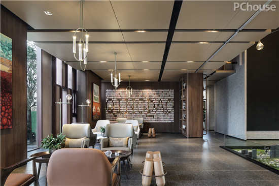 有别于常规售楼处的前厅接待台,本案将外观与功能一应俱全的咖啡吧台置于空间的入口,咖啡馆的形式与格调率先触达青岛人的审美体验,营造轻松融洽的空间氛围,达成美好观感的前置条件。咖啡吧背景墙的浅色回旋,一如卡布奇诺表层的奶泡纹路,与深咖色的实木吧台、清透澄澈的水滴灯饰,融汇成一幅现代时尚、香气浓郁的空间画面,醇厚的咖啡香气弥漫一室,别具一格的情调呼之欲出,咖啡文化的诗意切面展呈得淋漓尽致。
