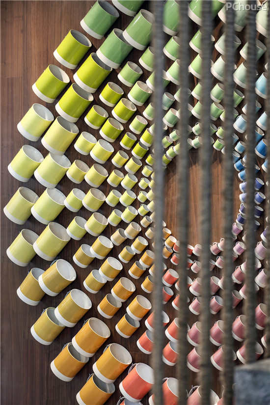 设计师以咖啡馆的一隅布设楼梯区域,延续咖啡文化与咖啡社交的场景意识,大小不一、颜色渐变的咖啡杯有序围合为交叠的圆形装饰了这一角落,色彩明丽而又井然有致。