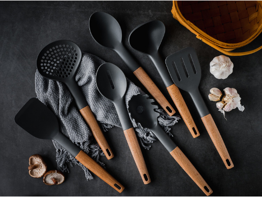 尼龙和木头都是轻质的材料,两者合体制造出的这套尼龙厨具系列,手感轻盈,用起来会非常得心应手。7款不同的厨具组合,可以应付几乎所有的厨房烹饪工作。尼龙黑色和榉木色的结合,质感十足,不管是什么色调的厨房都可以百搭,在细节处给你带来下厨的愉悦。