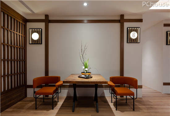 (图)设计师转化通往厨房的过道区块,摆上大胆的亮橘单椅搭衬实木方桌,一桌二椅的形制将闲而不散的生活步调表现得宜。