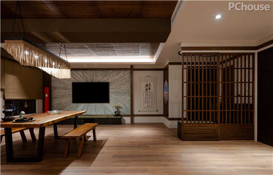 转过屏风,整座量体的细腻层次益加无尽袒露,天花板采用木格栅设计,暗中与玄关隔屏展现同样意趣,令人无法忽视其下连结的客制造型主灯——以文化意涵悠远的「注连绳」为主要材料,精细的长度变化仿如繁丽流苏,展现出设计师平衡华丽与简约的熟稔手艺,将充满祈福意味的灯光,撒上一家人团聚的长桌。有了绝美灯饰作为重点照明,承揽明亮的茶道桌亦尽现性格,实木桌板保留自然收边及原始树纹,体现日式美学中的「本色美」,提供众家人齐聚漫谈,饮一壶茶品一味悠闲。而在种种细腻设计中,电视主墙亦不能示弱,Yocico特地选用日式的特殊材质面料,运用纯手工涂刮,勾勒出「绽放」的视觉效果,使单一空间中,墙面与其他客制物件保有和谐而各居要位的对话关系。