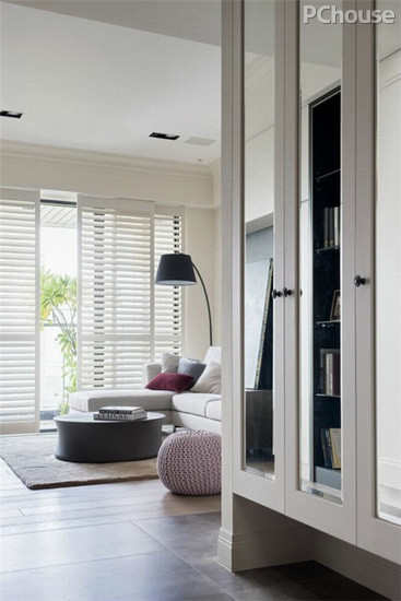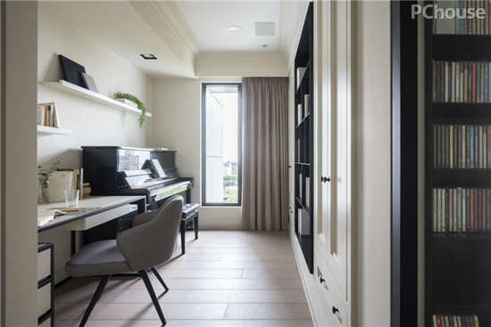 编辑点评:自公领域的轻浅色调一路延伸到书房,同样交织现代与轻古典的设计语汇,在大量净白的空间中,并缀以黑色展示柜与书桌线条,描绘简约且带质感的气息。