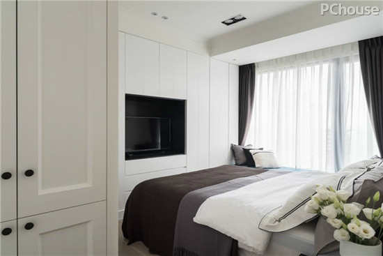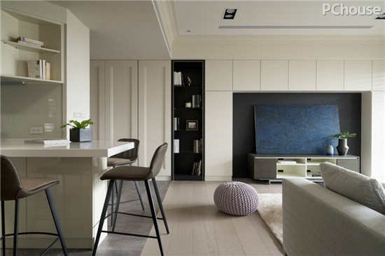 编辑点评:大量白底色调的空间,放大了空间尺度,电视柜以黑框设计,营造出电视与柜体融为一体的视觉感,减少视线上不必要干扰。