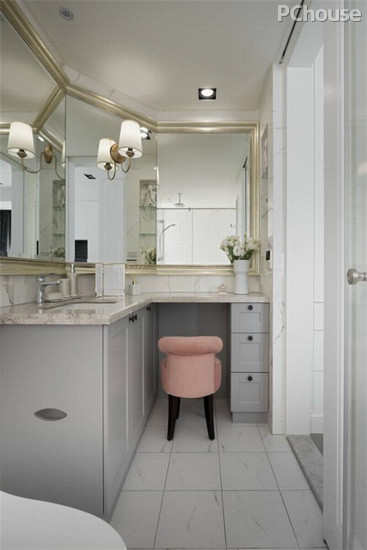 编辑点评:自然石材纹理,搭配L型斜镜化妆台设计,框构饭店等级的卫浴空间与洗浴享受。