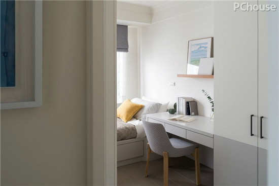 编辑点评:儿子房的空间色彩应用,书桌平面与衣柜、墙面切齐2种色块,以深灰色向上延续较浅色阶的灰色,创造壁面腰板的设计感。