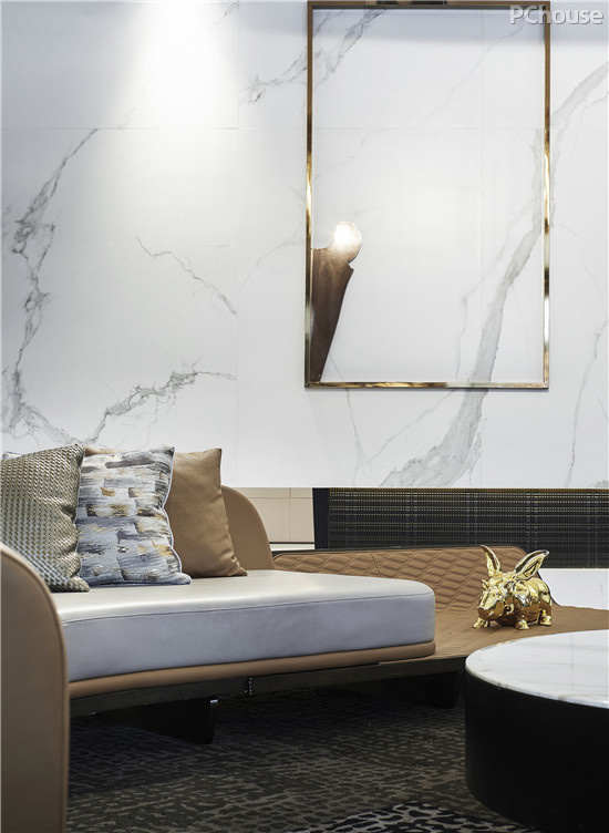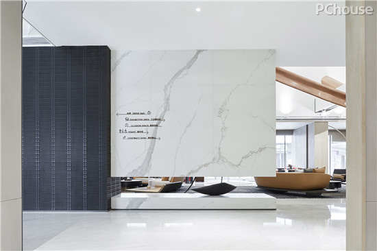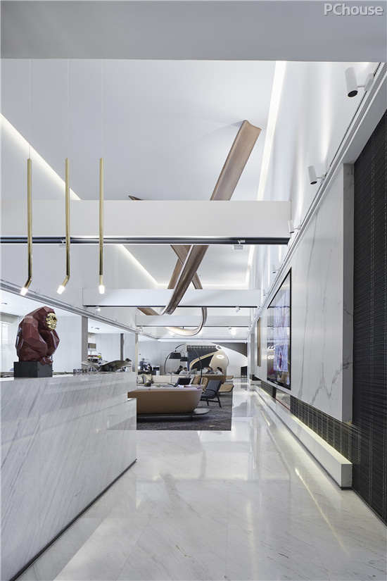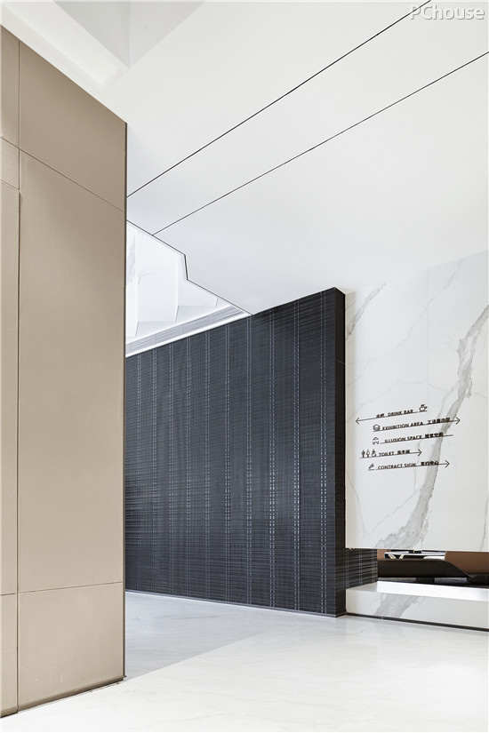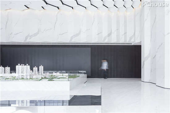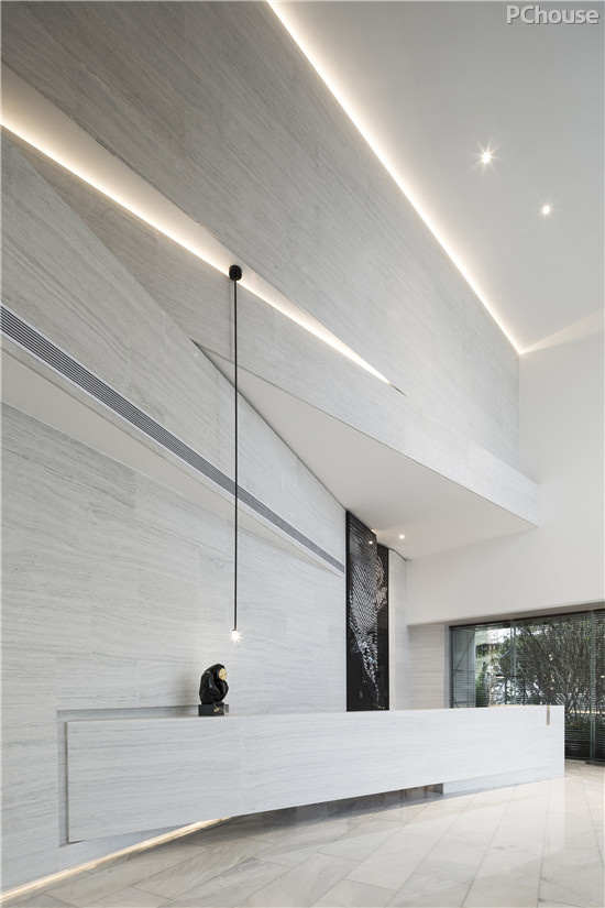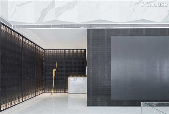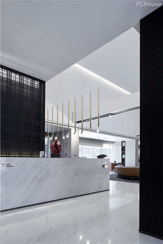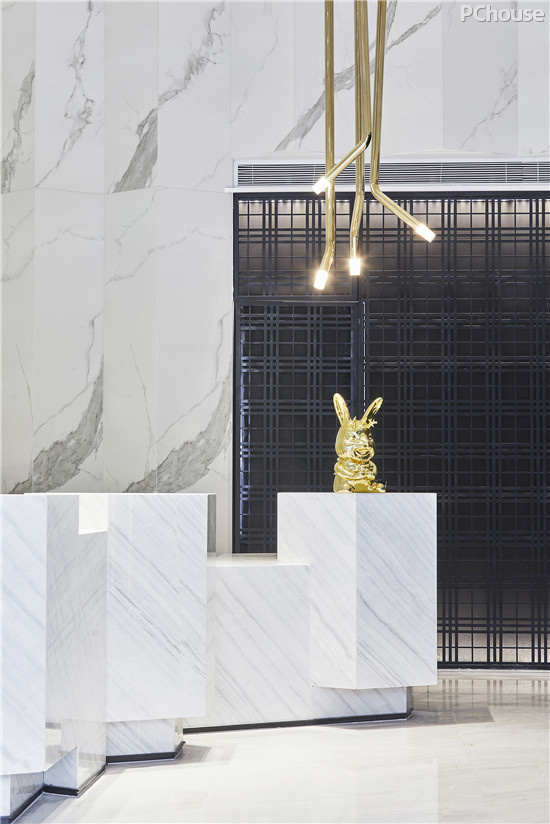接待区垂坠的LIBRA悬浮吊灯,以视觉上的纤细多变,营造出新的精致美学平衡感。棱形凸变的大理石墙体与接待台的形制相映成趣,加上层叠有致的金属网的嵌合,诠释空间独有的格调韵律。
