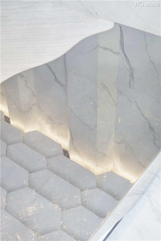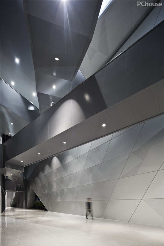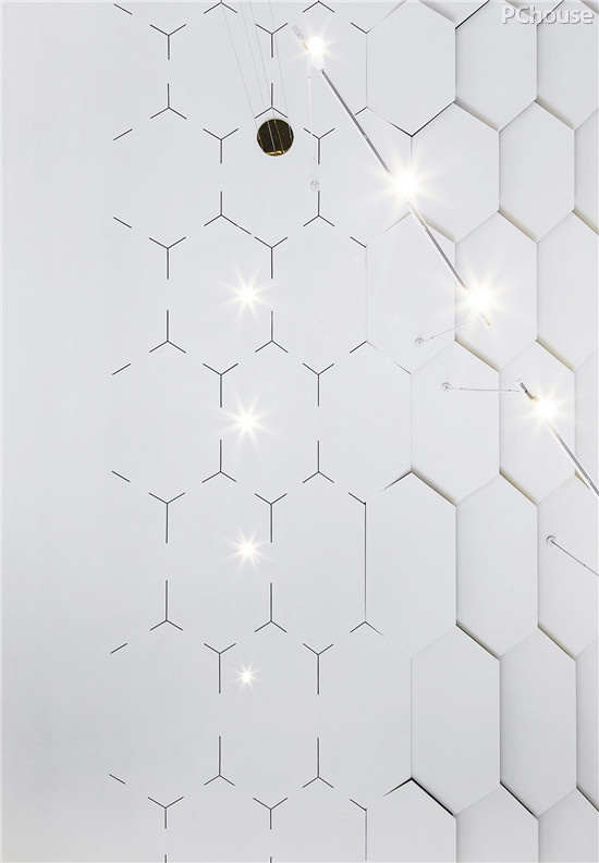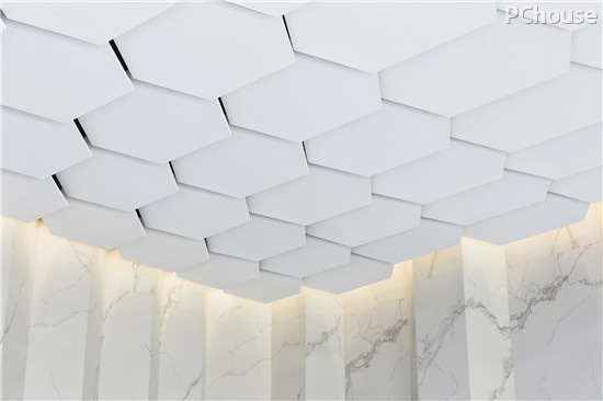 在天花处理上赋予了丰富的想象语言与艺术美感,水晶的璨斓珍稀寓意西宁凝结的文化芳华与自然情致。立体的六边形有机板材从三维形态到平面视觉的循序渐变,叠演出水晶形构的奥秘与美。