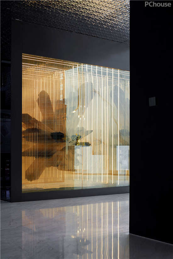 品牌展示区,设计提炼水晶的六方柱晶体标准形态,加之简化、重新组合其内的线条语言,在天花、墙体、柜台、软饰等空间内部细处达至新的和谐与节奏。过道所装挂的一幅艺术作品,粼粼波光的表面,像极了青海湖宁谧且灵动的水境,凝练出亦真亦幻的视觉体验,这是自然神工与设计巧思的碰撞。