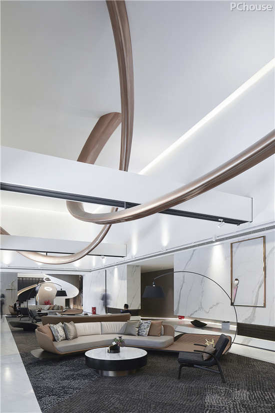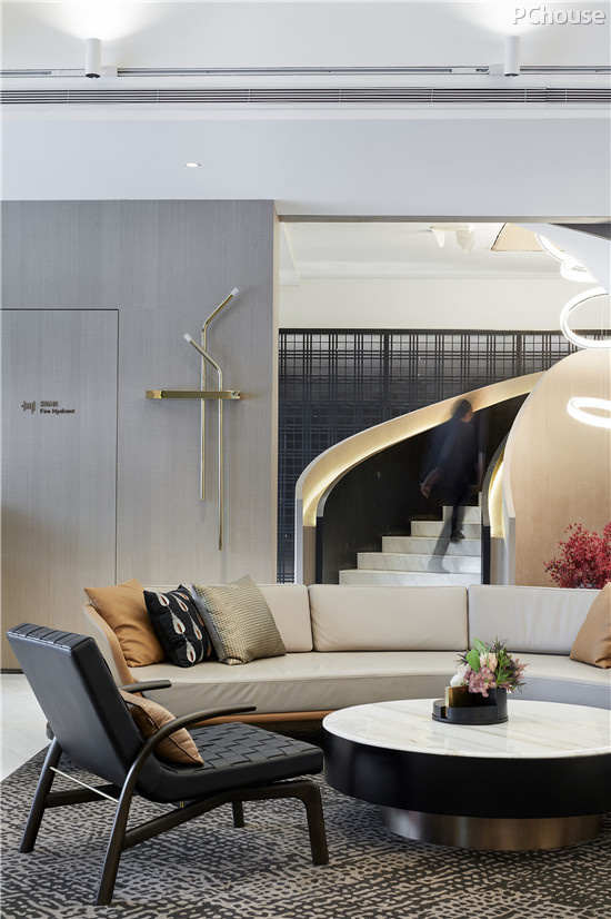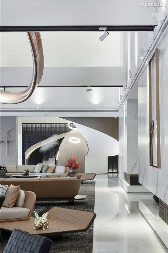 穿错相连的两个巨型木环置于朗阔气清的洽谈区中空,仿佛一个巨大的艺术装置,跃动出空间的视觉张力,亦重新解构和定义了空间的边界,引人无限遐思。