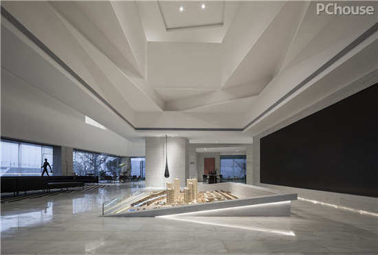 沙盘底座的设计别出心裁,运用两个错落的体块堆叠拼接,一改材料厚重之本质,显得轻幽而有灵气。另外,在底座一角装饰了一块似是不经意洒下的“水迹”,将空间清肃高雅的气韵瞬间宕开,添增想象与趣味的艺术语言。