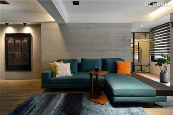 编辑点评:沙发背墙以水泥粉光为底,透过手刮的方式呈现独特肌理;家具的配色上,则在低调简约的色彩基调下,选搭一组抢眼的湖水蓝沙发,让空间跳脱出鲜明个性。