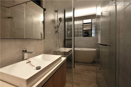 编辑点评:主卧卫浴采用石纹砖面佐上木纹砖地坪,温婉自然的气息,达到身心放松的效果。