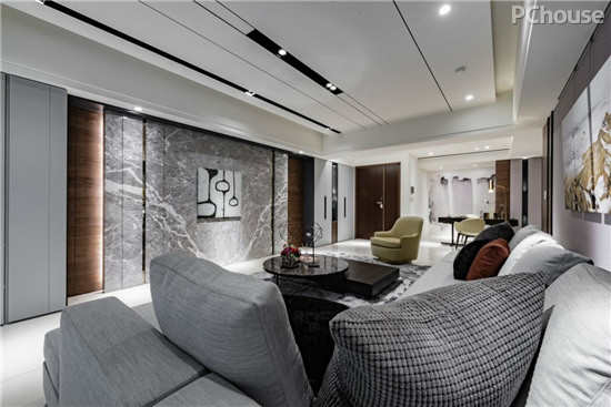 【太平洋家居网 设计频道】沉稳高雅的色调在全室白色磁砖的铺陈下,更显得洁净而贵气。浅灰色的大理石电视墙,对照着长毛银灰的地毯与灰色L型沙发,以内敛奢华手法衬托出事业有成的主人在居家生活领域中的无限尊荣感。 比沙列设计总监张静峰,大气的利用整片大理石打造出泼墨山水电视墙,更以切割线条的手法,呈现出层次立体感,由近到远,仿佛能感受波纹的流动,象征着风生水起的意象。(幸福空间供稿)