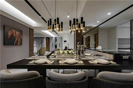 编辑点评:金与黑配色的餐吊灯,搭配6人长桌,尽显贵气与雍容感。