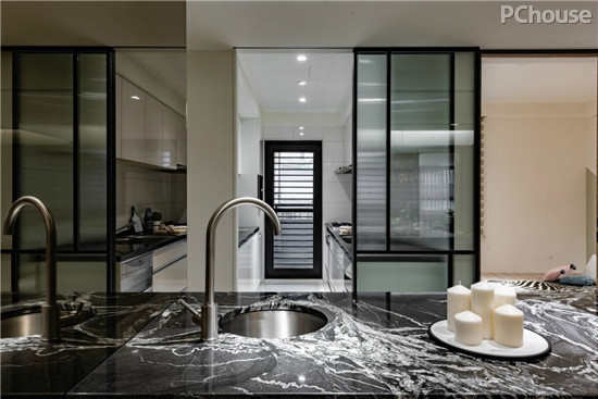 编辑点评:大理石中岛台延续了室内整体空间感,比沙列设计总监张静峰,以清玻璃及长虹玻璃门片区隔出厨房与餐厅,兼俱若隐若现的通透性。