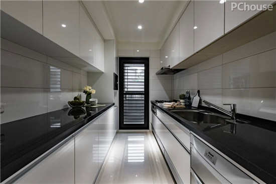 编辑点评:深长的一字型厨房空间,设计师在两侧都巧妙的加入了工作台面及收纳柜的设计。