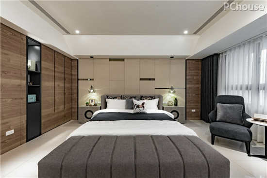 编辑点评:主卧的床头正对着大梁,比沙列设计总监张静峰特别以斜面设计削减了大梁的压迫感;床头墙以绷布及茶玻交错运用,呈现不规则的排列感。