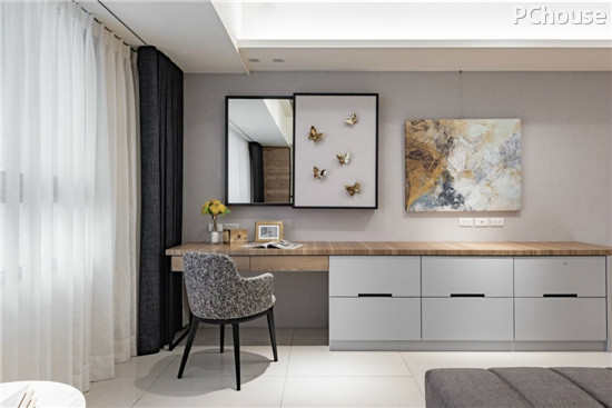 编辑点评:主卧的梳妆台位于床尾处,考量台湾人不喜欢一起床就面对镜子,设计师特别选用可以横移的镜柜,阖上时就如同一幅艺术装置。