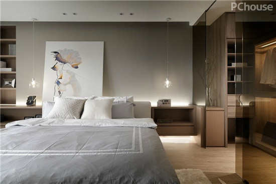 编辑点评:以茶玻为界线,区隔出独立的衣帽空间,通透的建材放大空间的视觉效果,舒压宽敞的感受,得到最高的睡眠品质。
