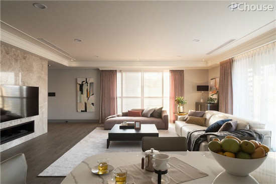 编辑点评:柔和暖色调铺排出客厅舒适氛围,辅以亮面大理石作为电视墙,展现天然石材的纹理,为空间刻划轩宇气韵。