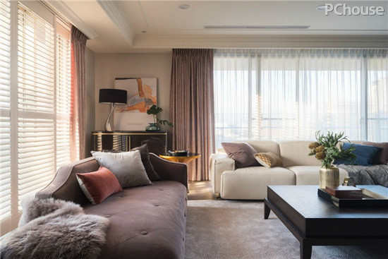 编辑点评:设计团队将最好的光线留给客厅,沐浴在光影照拂下,缀以具温度暖色调的沙发、抱枕、窗帘带领居家氛围,提亮空间彩度,因应季节不同,亦可更换不同软装营造多变情境。