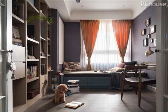 编辑点评:男孩房配置了书桌与卧榻区,让房间有了体现生活表现的一隅,另一侧则是结合衣橱与书柜的柜墙设计。