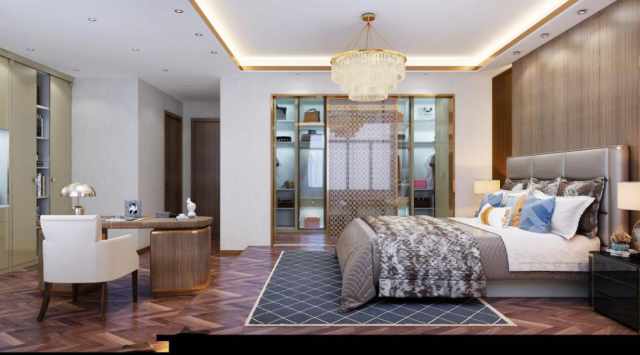 奢华的雍容点亮整个卧室,高贵金属与岁月金檀是对生活的赞美,流露在丰富的色彩和超现实的笔触之中,刚柔并济的整体构筑出一个梦幻的世界。在流金岁月中,感受一份静谧氛围。